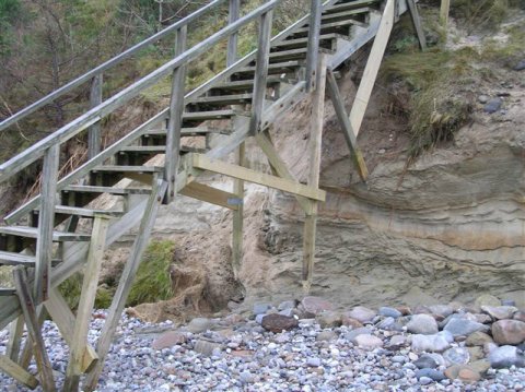 Stormen natten mellem søndag den 27. og mandag den 28. november har taget rigtig hårdt fat i vores kyst. Vi har næsten fået sandstrand, men vandet har skyllet store dele af skrænten væk. Og det har medført at de nederste 5-6 meter af den "gamle"del af trappen næsten hænger i den blå luft.